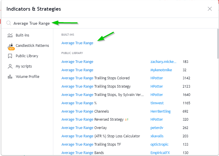 Vervolgens vul je in het inzoekveld of zoekbalk de term “Average True Range” in en je kiest voor de volgende default indicator: